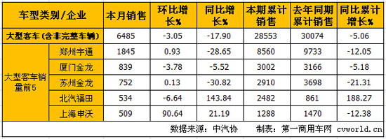 2014年5月份,大型客車(含非完整車輛)銷售6485輛,環(huán)比下降3.05%,同比下降17.90%。5月份,大型客車銷售(含非完整車輛)銷量前5的企業(yè)依次為鄭州宇通、廈門金龍、蘇州金龍、北汽福田和上海申沃,5家合計銷售4479輛,占大型客車(含非完整車輛)總銷量6485輛的69.07%。從增幅看,銷量前五企業(yè)環(huán)比上月僅有廈門金龍(-3.78%)和北汽福田(-6.64%)兩家企業(yè)出現負增長,上海申沃以513輛、環(huán)比增長90.64%的成績擠掉廈門金旅躋身銷量前五。與去年同期相比,銷量前3的企業(yè)均出現下滑,北汽福田以143.84%的增長率“傲視群雄”。