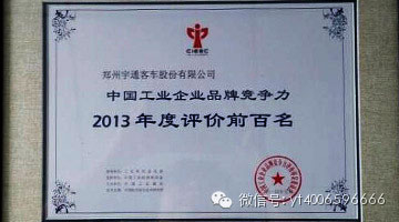 近日,由中國(guó)工業(yè)和信息化部指導(dǎo)發(fā)布的2013年中國(guó)工業(yè)企業(yè)品牌競(jìng)爭(zhēng)力評(píng)價(jià)結(jié)果揭曉。宇通客車(chē)榮獲“中國(guó)工業(yè)企業(yè)品牌競(jìng)爭(zhēng)力2013年度評(píng)價(jià)前百名”稱(chēng)號(hào),位列該排行榜第34名,成為我國(guó)客車(chē)行業(yè)內(nèi)唯一上榜企業(yè)。