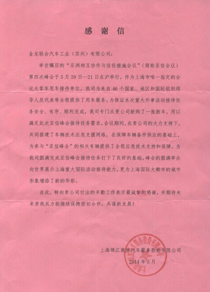 前期踏實細致的準備工作和完善的現(xiàn)場服務,保障了172臺海格客車在服務亞信會議期間零故障運行,獲得了國內(nèi)外朋友的高度贊揚和認可!百F公司的產(chǎn)品和服務為我司圓滿完成亞信會議接待任務打下了良好的基礎,會議的圓滿舉辦向世界展示了上海國際活動接待能力,……在此,特向貴公司付出的辛勤工作表示最誠摯的感謝,并期待未來貴我雙方繼續(xù)保持密切合作,共謀新發(fā)展”。錦江商旅在感謝信中對海格客車和服務的肯定,再次證明海格客車的優(yōu)秀品質(zhì)和優(yōu)質(zhì)的服務。