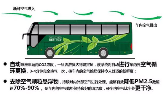 進到客車里,車內(nèi)悶熱且又散發(fā)著一股異味,尤其是炎熱的夏天,更是難受。安凱客車則是完全沒有這樣的問題,采用獨有的內(nèi)環(huán)境管理系統(tǒng)的安凱客車能夠自動感應(yīng)車廂內(nèi)二氧化碳的濃度,濃度達到預(yù)設(shè)值,系統(tǒng)便能在3-4分鐘內(nèi)完成全車換氣,空氣永遠都是如此的新鮮、清爽。