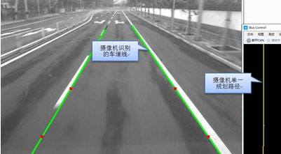最后,完成視覺單一導(dǎo)航測(cè)試,依靠高清工業(yè)相機(jī)利用算法識(shí)別車道線,并完成車道中心線路徑規(guī)劃,實(shí)現(xiàn)單一視覺導(dǎo)航(如圖3),并依此完成車道偏離預(yù)警、車道保持等輔助駕駛功能的研究和測(cè)試。