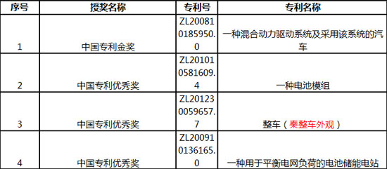 2015年10月27日,第十七屆中國(guó)專利獎(jiǎng)評(píng)審結(jié)果公示揭曉,比亞迪股份有限公司的“混合動(dòng)力專利技術(shù)”獲得中國(guó)專利金獎(jiǎng),這是汽車廠商首次在新能源領(lǐng)域獲此殊榮。此外,比亞迪還有三項(xiàng)專利獲得優(yōu)秀獎(jiǎng):秦外觀設(shè)計(jì)專利、電動(dòng)汽車電池專利技術(shù)、儲(chǔ)能系統(tǒng)專利技術(shù)。