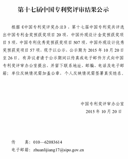 中華人民共和國(guó)國(guó)家知識(shí)產(chǎn)權(quán)局官網(wǎng)http://www.sipo.gov.cn/ztzl/ndcs/zgzlj/tz/201510/t20151020_1191102.html