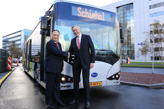 2015年11月25日,目前歐洲最大的一支純電動大巴車隊的正式投放儀式在荷蘭阿姆斯特丹史基浦國際機(jī)場(Amsterdam Schiphol Airport)舉行,該大巴由世界上最大的純電動大巴制造商比亞迪生產(chǎn),為機(jī)場乘客提供往返空側(cè)和陸側(cè)的零排放擺渡服務(wù)。此舉在同行業(yè)內(nèi)開創(chuàng)了先河,推動史基浦機(jī)場成為全球國際機(jī)場實現(xiàn)可持續(xù)發(fā)展目標(biāo)的典范。