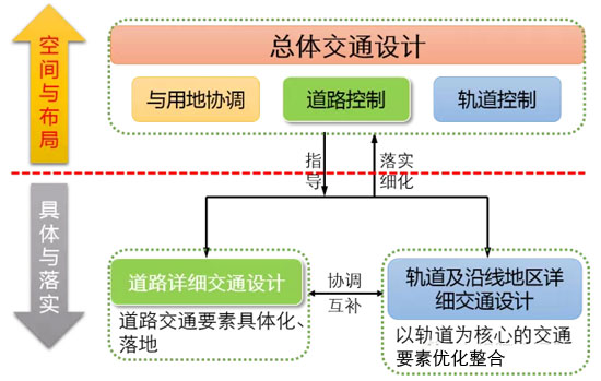 《導(dǎo)則》將交通設(shè)計(jì)這一工作內(nèi)容定位為“城市交通規(guī)劃設(shè)計(jì)與實(shí)施系統(tǒng)中必要環(huán)節(jié)和銜接手段”,如下圖所示,交通設(shè)計(jì)工作向上承接綜合交通規(guī)劃和各類(lèi)交通專(zhuān)項(xiàng)規(guī)劃(道路網(wǎng)、公共交通、軌道交通、步行和自行車(chē)等),向下指導(dǎo)具體的交通基礎(chǔ)設(shè)施的施工設(shè)計(jì)和實(shí)際建設(shè)。在城市規(guī)劃的技術(shù)體系內(nèi),交通設(shè)計(jì)是深化城市總體規(guī)劃戰(zhàn)略思路的有力工具,將相對(duì)抽象的規(guī)劃理念,通過(guò)具體化的控制要素進(jìn)行落實(shí),并在控制性詳細(xì)規(guī)劃和城市設(shè)計(jì)等環(huán)節(jié)中得以體現(xiàn)。