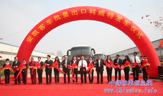 2015年4月29日上午,“安凱客車批量出口科威特發(fā)車儀式”在安凱客車廠區(qū)內(nèi)隆重舉行,安凱客車總經(jīng)理童永向客戶代表交付了新車鑰匙。