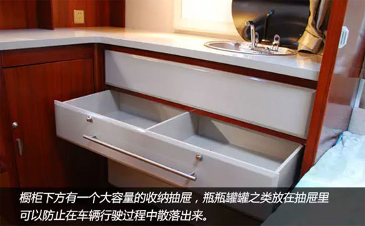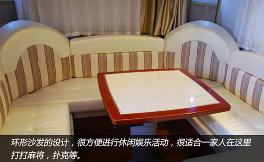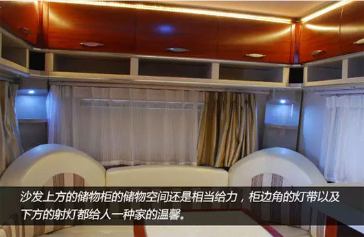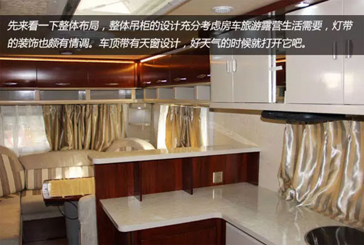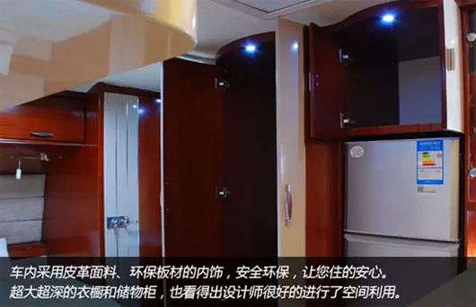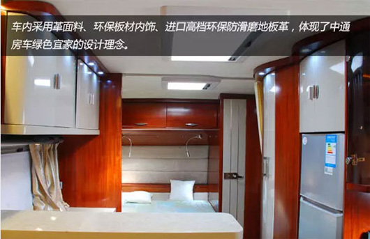 車輛家居內(nèi)設豪華雙人床、環(huán)形沙發(fā)、整體吊柜、整體櫥柜、整體衛(wèi)生間、豪華淋浴裝置、冷暖空調(diào)等設施,充分考慮房車旅游露營生活需要,滿足房車露營便捷、娛樂的需求。 車內(nèi)皮革面料、環(huán)保板材內(nèi)飾、進口高檔環(huán)保防滑磨地板革,體現(xiàn)了中通房車綠色宜家的設計理。