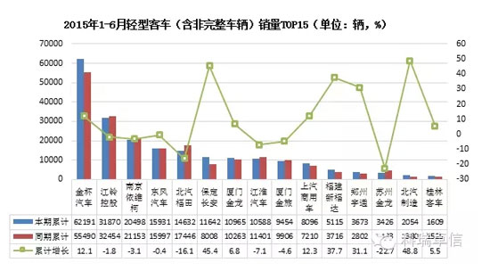 2015年6月國(guó)內(nèi)輕型客車(chē)(含非完整車(chē)輛)產(chǎn)量39822輛,累計(jì)產(chǎn)量218836輛,同比增長(zhǎng)7.55%,累計(jì)增長(zhǎng)6.24%;本月國(guó)內(nèi)輕型客車(chē)(含非完整車(chē)輛)銷(xiāo)量36605輛,累計(jì)銷(xiāo)量217556輛,同比增長(zhǎng)-0.83%,累計(jì)增長(zhǎng)4.35%。其中金杯汽車(chē)?yán)塾?jì)銷(xiāo)量排名第一,累計(jì)銷(xiāo)售62191輛,累計(jì)增長(zhǎng)12.1%;保定長(zhǎng)安和北汽制造今年增長(zhǎng)迅速,2015年1-6月累計(jì)增長(zhǎng)都超過(guò)40%。