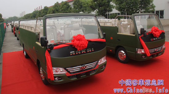 整裝待發(fā)的受閱客車安凱敞篷版寶斯通