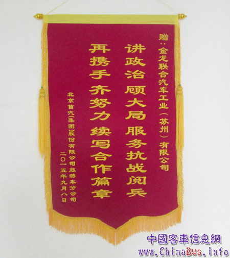 中國(guó)人民抗日戰(zhàn)爭(zhēng)暨世界反法西斯戰(zhàn)爭(zhēng)勝利70周年紀(jì)念活動(dòng)總結(jié)大會(huì)近日在京舉行,海格客車在抗戰(zhàn)閱兵運(yùn)輸服務(wù)中表現(xiàn)出色,得到了軍方和紀(jì)念活動(dòng)運(yùn)輸單位北京首汽(集團(tuán))股份有限公司的好評(píng)和表彰,首汽集團(tuán)為海格贈(zèng)送了“講政治顧大局服務(wù)抗戰(zhàn)閱兵、再攜手齊努力續(xù)寫合作篇章”的錦旗。