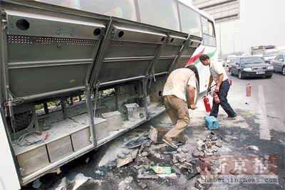 白色的大客車停在路邊,車旁兩側(cè)地上,幾十個電池箱還在冒煙,熱得燙手。昨日上午,朝陽區(qū)東五環(huán)東壩出口南側(cè),一輛由北向南行駛的大金龍客車自燃,事故未造成人員傷亡,受此影響,該路段短時間交通擁堵。該車上人員稱,該車是試驗車,正準(zhǔn)備送去檢驗。