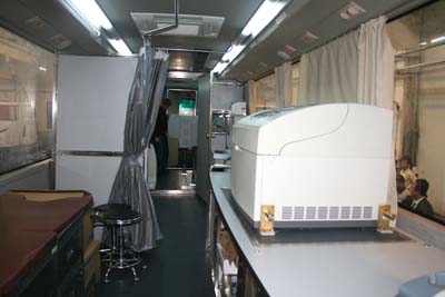 流動醫(yī)療車是在歐V客車BJ6120系列豪華城間客車基礎(chǔ)上研發(fā)設(shè)計(jì)的,該車相繼獲得“中國客車最具發(fā)展力產(chǎn)品獎”、“中國旅游客車金獎” 、“中國客車節(jié)油獎”、“中國最佳客車底盤獎”等諸多大獎,整車具有高性價比、高可靠性、大功率、低油耗、高安全性的特征。通過三個月的實(shí)地使用和監(jiān)測,福田歐V醫(yī)療車從車輛性能、設(shè)備配裝、車內(nèi)環(huán)境、使用便捷等方面均受到中醫(yī)藥衛(wèi)生發(fā)展基金會的認(rèn)可和好評。每輛車上都配裝了X光機(jī)、超聲機(jī)、全自動生化分析儀等必備的先進(jìn)醫(yī)療儀器設(shè)備,相當(dāng)于一座縣級醫(yī)院擁有的主要設(shè)備,除了大型的手術(shù)以外,體檢、治療、接生均可順利實(shí)施,基本上滿足牧區(qū)人民醫(yī)療保健的需要。