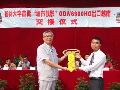 9月18日9:18分,桂林大宇客車有限公司雄獅起舞、鑼鼓喧天,在越南機(jī)械公司黎總經(jīng)理從桂林大宇趙在杓總經(jīng)理手中接過(guò)金鑰匙后,15臺(tái)“城市靚影”GDW6900HG城市公交車承載著中越友誼緩緩駛出公司大門,奔赴越南。這是桂林大宇繼7月批量出口越南后與該公司的第二次合作。