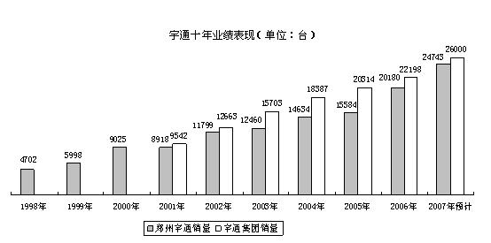 2007年1-10月宇通共銷售各類客車18845臺(tái),預(yù)計(jì)全年大中輕型客車總銷量將達(dá)26000臺(tái),相對(duì)于1998年的4702臺(tái),增長幅度達(dá)到553%,其中大中型客車國內(nèi)市場(chǎng)占有率2006年為18.4%。2007年預(yù)計(jì)達(dá)到19.8%。