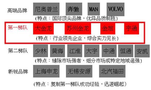 其中,由大金龍、小金龍、蘇州金龍和宇通組成的“三龍一通”陣營(yíng),挾多年辛勤耕耘收獲擴(kuò)大的市場(chǎng)份額,不斷創(chuàng)造品牌價(jià)值的新高,并且無(wú)愧成為行業(yè)的強(qiáng)勢(shì)品牌集團(tuán)。而三龍之中,大金龍以敏銳的市場(chǎng)嗅覺(jué)、強(qiáng)烈的品牌自覺(jué)意識(shí)、創(chuàng)造性的品牌推廣手法,敢為天下先,首先突破行業(yè)廣告投放的固有模式,一躍成為行業(yè)品牌的排頭兵。尤其在旅游客車市場(chǎng),曾經(jīng)一馬當(dāng)先,獨(dú)享半壁江山,其所擁有的