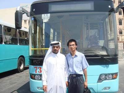 說起海格低地板公交車,還有一個有趣的故事。由于海格公交車采用了最新的電氣技術(shù),有很多新的功能和科技,一些卡塔爾的司機不是很清楚。公交車運行的第一天,我去了公交車站給部分司機做了培訓(xùn)。但到了第二天早上,就有電話打過來,說公交車路牌不顯示、自動伸縮踏步不工作。我和同事謝工趕過去一看,原來是路牌的開關(guān)沒有打開,一問才知道,今天換司機了,所以他不知道路牌開關(guān)在哪里。另外,對于車上裝配的自動伸縮踏步,在儀表臺上有個開關(guān),如果儀表臺上的開關(guān)沒有打開,后門處的按鈕也是不起作用的。我們把開關(guān)打開后,一切都正常,司機很高興,連連贊揚我們的客車先進。
