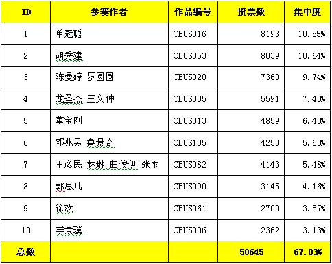 其中來自江西景德鎮(zhèn)陶瓷學院湘湖校區(qū)05工業(yè)設計系的單冠聰(作品編號:CBUS016)共獲得8193票,占總票數(shù)的10.85%,成為本次網(wǎng)絡投票的最大贏家。得票前10名的作品如下表所示,總計50645票,占總票數(shù)的67.03%。