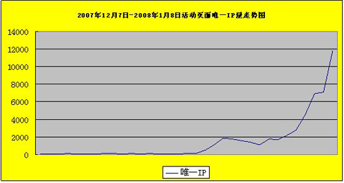 在網(wǎng)絡投票階段,大賽官網(wǎng)共被訪問176929次,下圖1所示為每日PV(Page View)值的走勢,圖2為IP地址走勢圖。12月底至1月初為投票的高峰期(作品發(fā)布的高峰期),尤其是1月份的最后幾天,參與網(wǎng)絡投票的人數(shù)大大增加。
