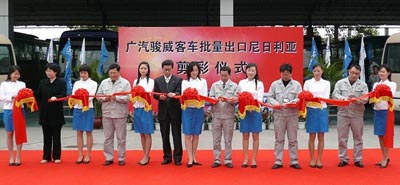 新春伊始,萬象崢嶸。2008年1月,廣汽駿威客車出口續(xù)傳捷報,繼去年成功挺進東南亞等海外市場,實現(xiàn)廣州汽車工業(yè)自主品牌出口零的突破以后,頻獲出口大單的廣汽駿威又迎來了非洲地區(qū)首批30臺GZ6700客車的訂單。為慶祝本批出口車輛順利下線,廣汽駿威于1月24日隆重舉行“廣汽駿威客車批量出口尼日利亞剪彩儀式”。