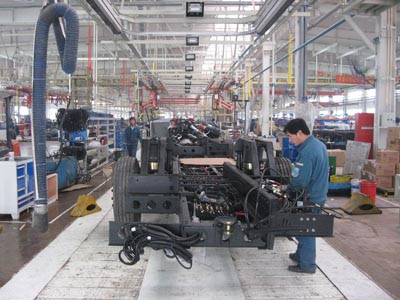 此次新建底盤裝配線是目前國內(nèi)技術(shù)設(shè)備最先進(jìn)、生產(chǎn)效率最高的客車底盤裝配線,它在提高生產(chǎn)效率、保證產(chǎn)品質(zhì)量、優(yōu)化工作環(huán)境三方面有了顯著提升,并采用了多項(xiàng)先進(jìn)工藝。一是實(shí)現(xiàn)了輸送自動化。新建底盤裝配線中,大的工件,如前后懸架、發(fā)動機(jī)總成、輪胎全部采用空中輸送,可大幅提高物流輸送效率。同時(shí),裝配線還設(shè)置了8條板鏈輸送線,生產(chǎn)用工藝小車隨鏈在地下軌道自動返回,完全采用節(jié)拍化生產(chǎn)。生產(chǎn)線起停設(shè)有信號燈或鈴聲提醒,工位設(shè)置起動、急停按鈕,保證安全生產(chǎn)的同時(shí)實(shí)現(xiàn)了柔性化生產(chǎn)。二是實(shí)現(xiàn)了裝配自動化。底盤關(guān)鍵部件,如輪胎、前后橋、離合器等,均采用了機(jī)械手裝配和智能化緊固設(shè)備,可有效保證關(guān)鍵部件的裝配質(zhì)量和效率。三是實(shí)現(xiàn)了環(huán)境優(yōu)化。裝配線采用了集中加注工藝(底盤防凍液、柴油、柴機(jī)油、齒輪油、轉(zhuǎn)向油等采用集中罐體供應(yīng),分點(diǎn)定量加注),設(shè)置了尾氣收集系統(tǒng)(底盤發(fā)動工位設(shè)置隨車尾氣收集系統(tǒng)),進(jìn)一步改善了員工工作環(huán)境。同時(shí),生產(chǎn)現(xiàn)場還設(shè)置了電話點(diǎn),并在關(guān)鍵工位設(shè)置了工業(yè)電腦,為員工工作提供了便利。此外,裝配線還采用了板簧壓裝工藝,即壓裝模擬實(shí)車滿載時(shí)板簧狀態(tài),提高板簧裝配質(zhì)量。抽真空加注工藝,即轉(zhuǎn)向油、離合器油加注采用管路抽真空處理,提高了轉(zhuǎn)向和離合器系統(tǒng)的裝配質(zhì)量。底盤檢測也采用德國、美國等國際先進(jìn)設(shè)備,保證了底盤整體裝配質(zhì)量。