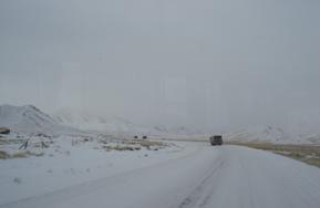 車隊(duì)駛出西寧,慢慢的感受到人煙漸漸稀少,同時(shí)也感嘆祖國疆土的遼闊。幾百公里后,我們來到向往已久的著名的青海湖,但一看才知道我們來的不是時(shí)候,因?yàn)楝F(xiàn)在的青海湖面全是冰,除了在湖邊能偶爾看到一群群羊外,剩下的就是白茫茫的一片。遺憾之余,還是在湖邊留下了我們疲憊的身影。不久,我們進(jìn)入了“無人區(qū)”,一眼看去看不到人員活動(dòng),漫山遍野的白雪,車隊(duì)是在白帶上行駛??赡茉谙奶鞈?yīng)該又是一番景色,因?yàn)槠鸫a有大片的綠草和牛羊。在此同時(shí)我們感覺到有些不適,呼吸緊促、頭有點(diǎn)脹,可能是在青海湖邊停下來擺了幾個(gè)姿勢拍照引起的反應(yīng)。趕緊服下備用耐缺氧、耐疲勞的藥品,吸氧并盡量保持少運(yùn)動(dòng)狀態(tài)。