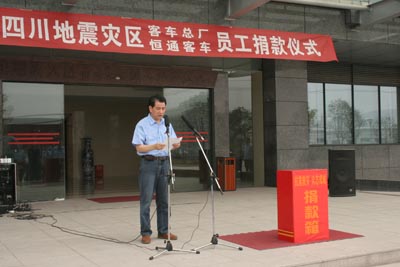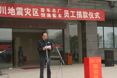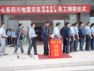 這場災(zāi)難也牽動(dòng)著重慶恒通客車有限公司上下員工的心,地震發(fā)生后,恒通客車高層領(lǐng)導(dǎo)高度關(guān)注、快速反應(yīng),在第一時(shí)間召開專題會(huì)議,成立了以鄧平總經(jīng)理為組長的“賑災(zāi)領(lǐng)導(dǎo)小組”,帶領(lǐng)小組成員積極部署救災(zāi)賑災(zāi)工作。迅速組織公司內(nèi)部和社會(huì)一切力量募捐災(zāi)區(qū)人民所需的款、食品、水、藥、被服及露宿帳篷等急需用品。組織“重建家園  恒通愛心接力在傳遞”活動(dòng),呼吁社會(huì)各界發(fā)揚(yáng)人道主義精神,積極行動(dòng)起來,奉獻(xiàn)愛心,全力以赴,與全國人民一道攜手同心,眾志成城,早日贏得抗震救災(zāi)的勝利!