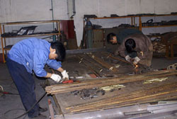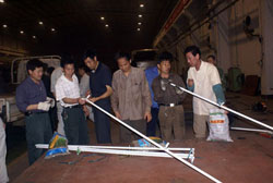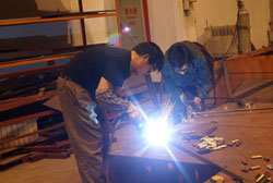 5月21日晚,記者在東風(fēng)旅行車公司見到,整個焊裝車間燈火通明,焊花飛濺,電弧閃明,一片繁忙的景象,近50余名工人在陣陣刺耳轟鳴聲中切割鋼管、焊接支架。他們正在緊張的為四川汶川地震災(zāi)區(qū)人民趕制帳篷支架。