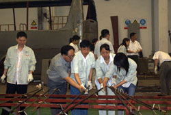 公司勞務(wù)明星員工黃志賢聽說是為災(zāi)區(qū)趕制帳篷,勁頭十足?!澳転闉?zāi)區(qū)人民出力,感到十分自豪,不睡覺也要早點(diǎn)焊好支架”黃志賢告訴記者。