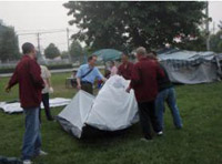 在工作人員的幫助下,我們得到了停車的位置,并找到了我們搭帳篷的空地。周圍的“鄰居”都過來幫我們,還給我們送來他們的小板凳、小桌椅等招呼我們坐,大家相互問長問短,沒有一點陌生感。鄰居告訴我們,他們是12號那天下午搬來的,家里的房子震裂了,需要災(zāi)后加固才能使用,家人都很幸運(yùn)沒有傷亡?,F(xiàn)在他們的基本生活沒什么問題,物價也沒漲,才上市的桃子才1元錢斤,讓我們一定在附近買點來嘗鮮。附近的超市基本生活物資也有供應(yīng),就是帳篷很緊張,篷布市面上買不到,只能用塑料薄膜“蓋房子”,政府得到的捐贈帳篷都要送到受災(zāi)更嚴(yán)重的災(zāi)民手里去,他們前幾天也都主動到重災(zāi)區(qū)去支援和捐款了,“我們畢竟幸運(yùn)得多!四川人都是一家人,我們應(yīng)該去幫助我們的家里人!”
