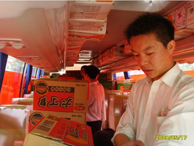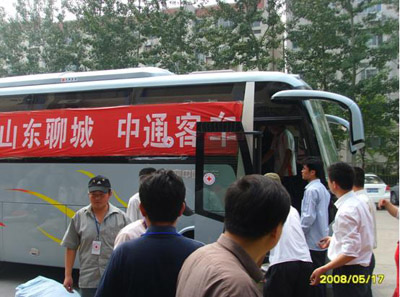 2008年5月17日上午兩輛載滿了中通客車全體員工深深祝福,滿載著災(zāi)區(qū)急需的食品和衣物的客車緩緩地駛出公司廠門口,浩浩蕩蕩的向?yàn)?zāi)區(qū)進(jìn)發(fā)。