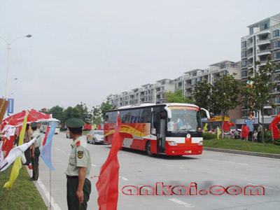 9:20分,奧運圣火來到了政務(wù)廣場,這是我們期待已久的?;鹁媸质殖帧跋樵啤笔セ鹣蛭覀兒吐放缘娜罕娬惺质疽?,大家情緒高漲,高喊“中國加油”、“奧運加油”、“安凱加油”的口號,并打出了“安凱客車支持奧運”的標語。火炬手跑完該段路程后,與另外一名火炬手進行火炬接力,隨即他登上了安凱客車與其它火炬手匯合。在火炬?zhèn)鬟f期間,有近6輛安凱客車從我們面前駛過,安凱客車滿載奧運火炬手,承擔(dān)起護送和保護奧運火炬手安全的的光榮使命。在滿載著奧運火炬手的安凱客車后面,還跟著兩輛安凱公司制造的“特警車”,里面滿載武警人員,應(yīng)對隨時發(fā)生的問題。這讓在場的每一個安凱人都感到由衷的自豪,他們都激動的吶喊著:“快看,安凱客車,那是我們的客車!”
