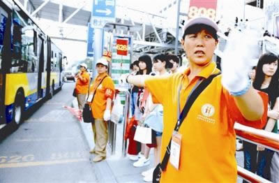 幾名女志愿者在北京街頭公交站點(diǎn)維持秩序。自從7月20日采取單雙號(hào)限行措施以來,每天乘坐公交車出行的乘客增加了80余萬人次,公交集團(tuán)也在本周一創(chuàng)造了1384.6萬人次的客運(yùn)量新紀(jì)錄,這其中還不包括含持奧運(yùn)證件乘車的免票人次。
