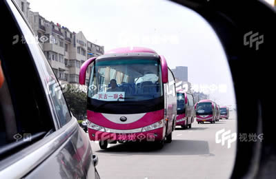 2008年9月10日,安徽滁州,倒車鏡中顯現(xiàn)出的一輛輛輛嶄新豪華客車整齊出發(fā)。