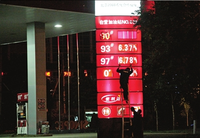 今天零時左右,望京一加油站工作人員在更換價牌