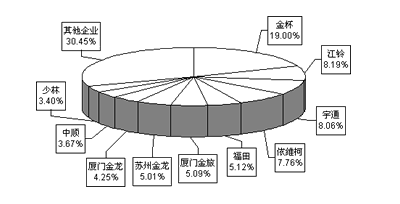 前十強企業(yè)市場占有率依舊占最大比重,宇通、金龍聯(lián)合(廈門)等表現(xiàn)更為突出