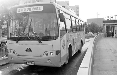29日7:32,在花園莊路口,兩輛由北向南行駛的BRT車中間夾著一輛 70路公交進入專用道。前面的BRT進站??繒r,70路車只能跟著停下,而后面的BRT因為有70路車擋著進不了站。在東倉路口,由于沒有安裝護欄,不少社會車輛看普通公交走BRT專用道也跟著走,結(jié)果BRT車靠不了站臺,等了兩個信號才過去。