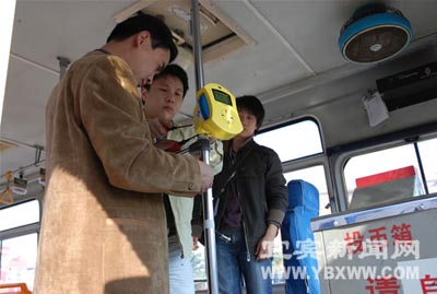 工作人員正在安裝公交IC卡智能收費(fèi)系統(tǒng)