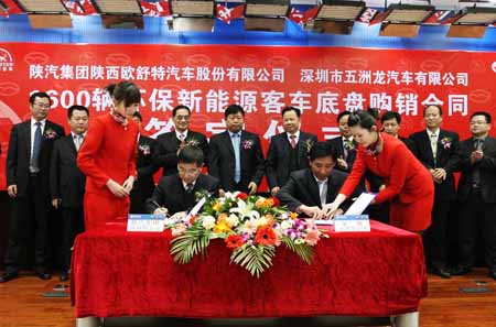 2009年全球第一大環(huán)保客車合作項目簽約儀式3月7日下午在我公司北郊總部舉行。陜汽集團陜西歐舒特汽車股份有限公司供深圳市五洲龍汽車有限公司1600臺環(huán)??蛙嚨妆P,其中1000臺為SX6112KD混合動力客車底盤,600臺為SX6115GL53TLNG客車底盤。該合作項目的簽約是兩家公司踐行科學發(fā)展觀,節(jié)能減排,注重社會效益,利國利民之舉。