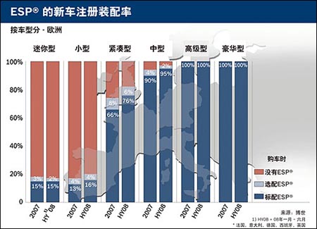 ·2008年上半年度,德國81%的新注冊乘用車裝配了ESP?,歐洲53%的新注冊乘用車裝配了ESP?