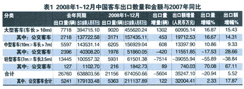 2.2008年1—12月公交車出口數(shù)量為5363輛,占總體出口數(shù)量21156輛的25.35%,而去年同期公交車出口數(shù)量為5241輛,占總體出口數(shù)量26760輛的19.60%,整體上升了近6個百分點。說明公交車的出口已經(jīng)越來越被各個客車制造企業(yè)重視了。