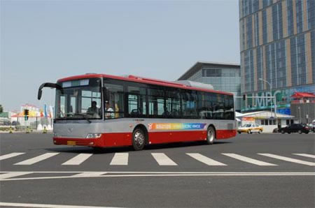 圖為在北京投入實(shí)際運(yùn)營的大金龍XMQ6125GH新型混合動(dòng)力城市客車