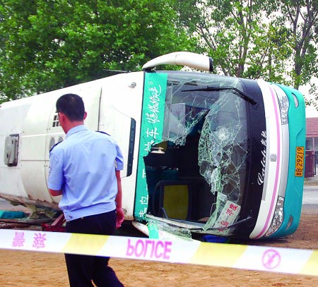 目擊者張先生告訴記者,他當時正駕車沿青沙路向藍村方向走,到了王家辛莊路段時,突然一輛大客車從后面超過他駕的車朝前開去,速度很快。在一個拐彎處,大客剎車減速時突然失控,滑出十多米遠后側翻。一名女乘客被甩出車窗,壓在側翻的客車車身下。長途車上一名姓崔的乘客說,當天他乘車去平度出差,車禍發(fā)生得很突然,車上的乘客根本沒來得及反應客車就側躺在地上了。