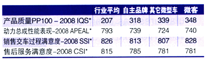 通過2008年J.D,Power在中國多個聯(lián)合調研的數(shù)據(jù)分析,我們發(fā)現(xiàn)微客的產品質量、產品性能和銷售售后渠道的表現(xiàn)略低于國內乘用車的平均水平,與自主品牌平均水平相近,略好于其它微型車的平均水平。目前微客的質量并不是想象中的哪么差,PPl00不到350。PP100(Problemsper100Vehicles)是指每百輛新車(購車2—6個月)出現(xiàn)的問題數(shù),如350PPl00相當于每輛車出現(xiàn)3.5個問題,分值越低表明問題越少質量越好。其中,上汽通用五菱在產品質量上表現(xiàn)相對突出,其PPl00的成績不到300,且其中大部分也是小問題。對于希望加入微客市場競爭的主流車企來說,在低成本的同時,還要確保產品質量,也并不是想象中那么簡單。