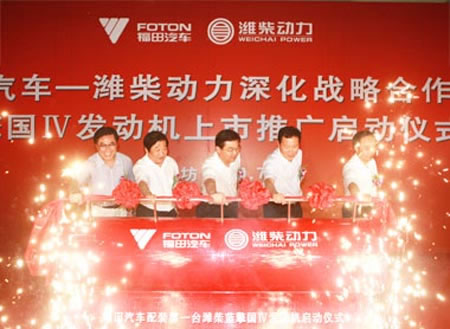 福田汽車和濰柴動(dòng)力,7月6日在濰坊共同舉行“福田汽車——濰柴動(dòng)力深化戰(zhàn)略合作暨藍(lán)擎國(guó)IV發(fā)動(dòng)機(jī)上市推廣啟動(dòng)儀式”,宣布深化戰(zhàn)略合作,共同推廣藍(lán)擎國(guó)IV發(fā)動(dòng)機(jī)。濰坊市委常委、市長(zhǎng)許立全及有關(guān)市領(lǐng)導(dǎo)宋赤峰、陳仁杰,濰柴動(dòng)力董事長(zhǎng)譚旭光,福田汽車總經(jīng)理王金玉共同啟動(dòng)第一臺(tái)配裝福田汽車的藍(lán)擎國(guó)IV發(fā)動(dòng)機(jī)。