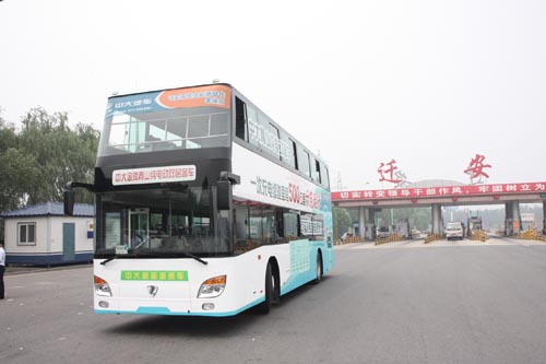 7月16日,中大青山純電動客車500公里示范運行在首都北京圓滿收官。此次示范運行,從北京出發(fā),經(jīng)京沈高速,續(xù)馳到唐山市遷安鎮(zhèn),再返回首都北京,全程約500公里,行駛了約7小時30分。參與全程實況示范運行的單位有:中國道路運輸協(xié)會、中國公路學(xué)會客車分會、民生銀行、渣打銀行、鹽城市人民政府、公證處、北京電視臺、人民網(wǎng)、新浪網(wǎng)、搜狐網(wǎng)、《科技日報》、《每日經(jīng)濟(jì)新聞》、《中國工業(yè)報》、《中國汽車報》、《中國交通報》、中國客車信息網(wǎng)等30多家媒體代表。中大集團(tuán)董事長徐連國、總裁徐連寬、副董事長張玉清,青山能源研究所所長王昌華等一同參加了全程示范運行 。