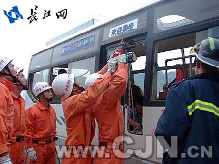根據(jù)現(xiàn)場人員的傷勢情況,救援人員決定首先從坐在車門口的被困者開始實施營救,三名特勤班戰(zhàn)士攜帶救援工具進(jìn)入車內(nèi)實施作業(yè),他們用頂桿、鐵鋌、擴(kuò)張器等工具對被困乘客進(jìn)行一一解救,另兩名在車門口遞送傷者,加快救援步伐。此時,恩施消防支隊紀(jì)委副書記馬紹洪帶領(lǐng)支隊全勤指揮部人員趕到現(xiàn)場指揮施救,市公安局副局長姚衛(wèi)平聞訊后也立即趕赴現(xiàn)場指揮救援。