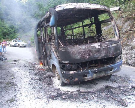 當天16時20分,大化瑤族自治縣板升鄉(xiāng)劉某駕駛中型普通客車(核載19座),由東蘭縣花香鄉(xiāng)往金城江區(qū)九圩鎮(zhèn)方向行駛,行至九圩鎮(zhèn)梅洞村路段時,駕駛室儀表板突然冒出黑煙,隨即線路短路起火,車廂內(nèi)煙火彌漫。駕駛員劉某見狀,立即停車打開車門,車上12名乘客及時逃生。由于火勢兇猛,車上滅火器無法控制大火,在消防員趕到時車輛已被燒得只剩下殘骸。