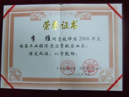 作為南昌市的重點出口單位,百路佳公司憑借優(yōu)異的出口業(yè)績?yōu)?8年交出一份滿意答卷的同時,也讓公司董事長李維的個人領導魅力彰顯無遺。在2009年7月22日召開的由南昌市委、南昌市人民政府組織的“2008年度工業(yè)發(fā)展先進個人和企業(yè)表彰大會”上,李維董事長被南昌市政府授予“2008年度突出貢獻企業(yè)家”榮譽稱號,榮獲此榮譽的還有江鈴企業(yè)董事長等18位優(yōu)秀的企業(yè)領導人。