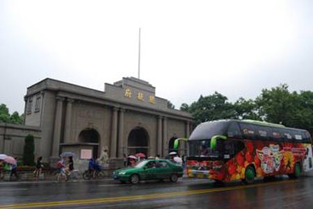 7月30日,為了給南京的三場音樂會造勢,一輛DD6129K02型豪華旅游大巴開上了南京街頭,南京站、玄武湖、南京長江大橋、中山陵園、總統(tǒng)府、夫子廟等重要建筑前都留下了黃海音樂大巴的身影。而在南京綠博園的演出現場,黃海音樂大巴更是成為舞臺背景的一部分,兩輛黃海豪華大巴一左一右位于舞臺的兩側,使人在觀賞樂隊演出的同時,更欣賞到黃??蛙嚨膭e樣美感。