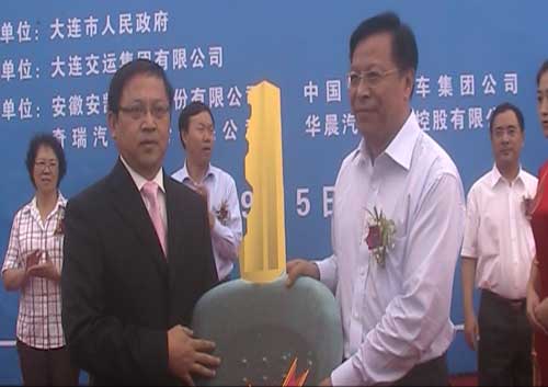 安凱客車(chē)副總經(jīng)理程小平向大連市委交付車(chē)鑰匙